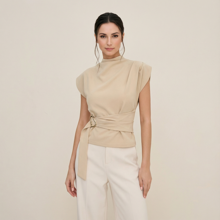 بلوزة أنيقة بتصميم يبرز الخصر من خلال لفّة جانبية مربوطة بإبزيم معدني فاخر