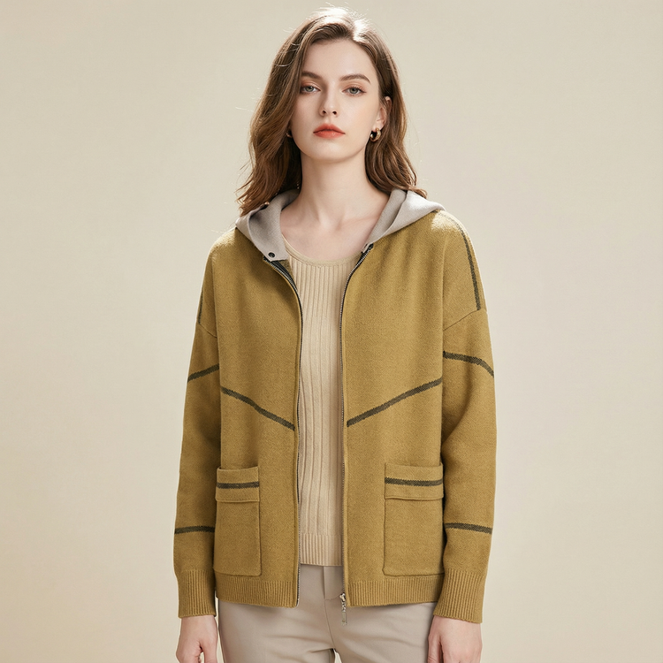 جاكيت صوفي أنيق بتصميم هادئ وتفاصيل بسيطة على الأكمام، يضيف لمسة مرتّبة ومظهر ناعم يناسب الإطلالات اليومية الراقية