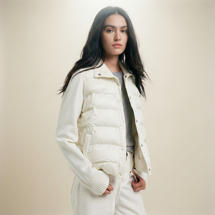 جاكيت أنيق يجمع بين جسم مبطّن يمنح مظهرًا مرتبًا وبين أكمام محبوكة تضيف لمسة ناعمة للتصميم